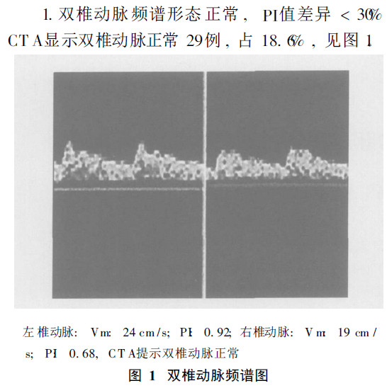 3. 雙椎動脈波峰圓鈍,CTA或DSA顯示一側(cè)椎動脈狹窄25例, 占16. 0% , 雙側(cè)椎動脈狹窄30例, 占19. 2% , 一側(cè)椎動脈狹窄,另一側(cè)椎動脈閉塞14例, 占