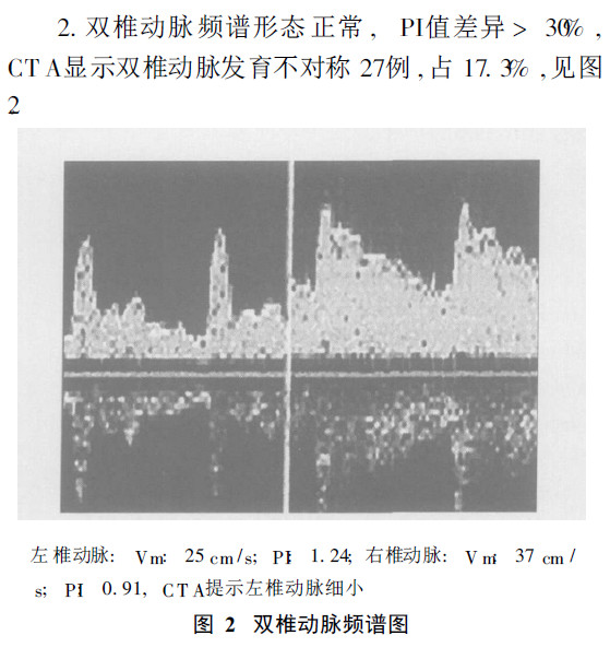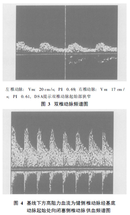 4. 頻譜呈高聳, 尖窄形態(tài), PI值> 3. 5。CTA顯示一側(cè)椎動脈閉塞23例, 占14. 8% , 基底動脈重度狹窄8例, 占5. 1% , 見圖4。