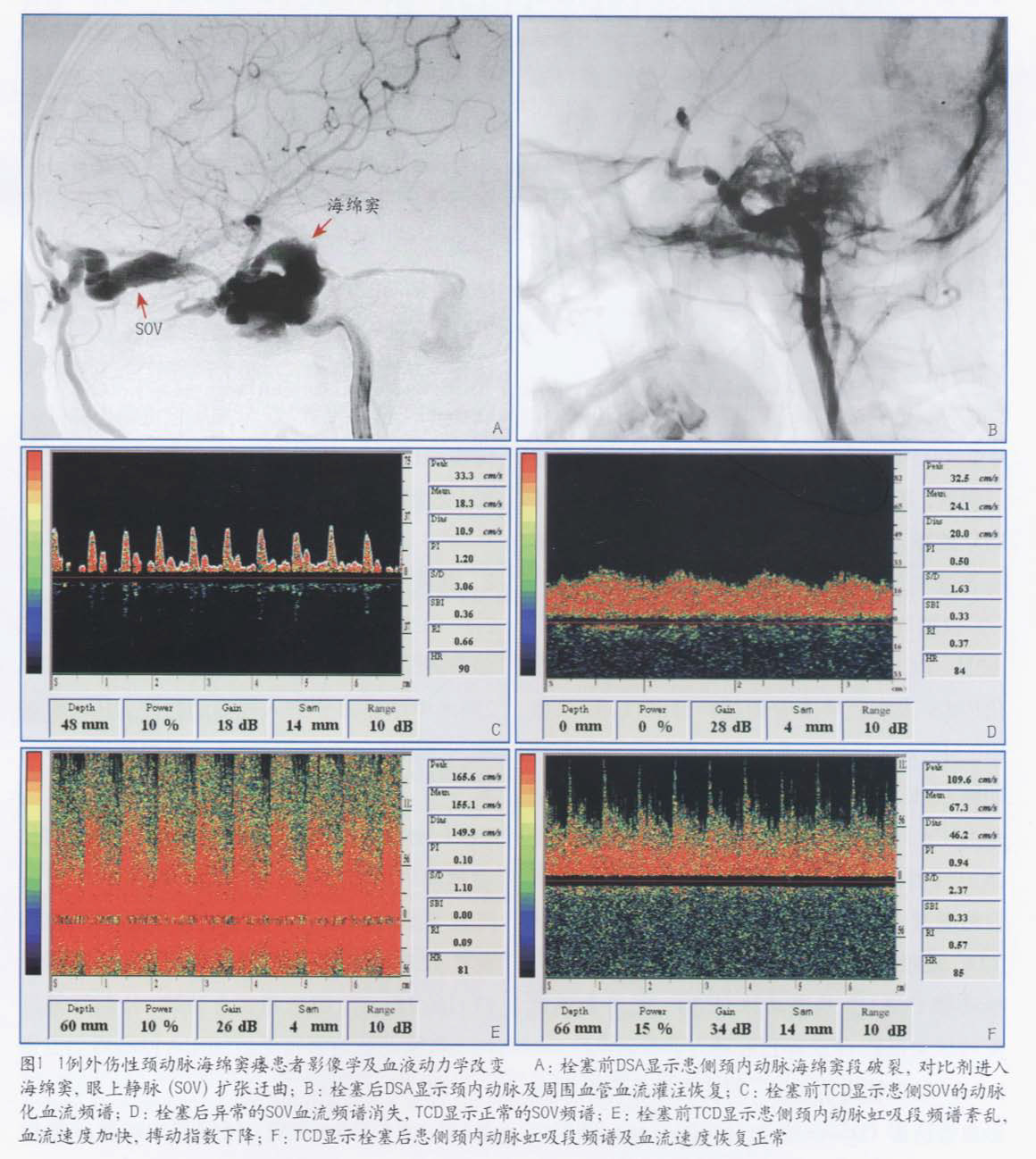 結(jié)論:TCD在檢測椎-基底動脈狹窄過程中發(fā)揮了不可替代的作用。《外傷性頸內(nèi)動脈海綿竇瘺患者介入治療的血液動力學(xué)分析》(Chin J Stroke, Jan 2008, Vol 3, No.1)目的:應(yīng)用經(jīng)顱多普勒超聲(德力凱EMS-9U型號)觀察外傷性頸內(nèi)動脈海綿竇瘺(CCF)患者介入治療(可脫式球囊栓塞術(shù))前后的血液動力學(xué)變化。方法 :回顧分析2000年2月至2007年10月間介入治療的18例外傷性CCF患者的TCD結(jié)果,并將手術(shù)前后的TCD與數(shù)字減影血管造影術(shù)(DSA)的檢查結(jié)果進行比較。結(jié)果 :經(jīng)DSA證實的18例CCF患者15例行可脫式球囊栓塞術(shù),DSA證實手術(shù)一次成功;2例術(shù)中改為ICA閉塞術(shù),術(shù)后DSA顯示患側(cè)ICA完全閉塞;另1例術(shù)中出現(xiàn)血管痙攣而被迫放棄手術(shù)。術(shù)前TCD檢測:(1)17例患側(cè)頸內(nèi)動脈顱外段和(或)頸內(nèi)動脈虹吸段血流速度加快,脈動指數(shù)(PI)值均減低,其中頸內(nèi)動脈虹吸段加快者伴頻譜紊亂。(2)10例患側(cè)大腦中動脈(MCA)、16例患側(cè)大腦前動脈(ACA)血流速度減慢伴PI值下降。(3)11例患側(cè)大腦后動脈(PCA)、14例健側(cè)ACA流速加快,頻譜形態(tài)正常。(4)16例患側(cè)、2例雙側(cè)眼上靜脈(SOV)呈現(xiàn)反向的靜脈動脈化頻譜。術(shù)后1周及6個月后復(fù)查TCD顯示,15例球囊栓塞患者術(shù)前異常的頸內(nèi)動脈及SOV等血管的血液動力學(xué)參數(shù)均恢復(fù)或接近正常,2例行ICA閉塞術(shù)患者TCD顯示患側(cè)ICA完全閉塞(患側(cè)大腦后動脈及健側(cè)大腦前動脈流速加快)。