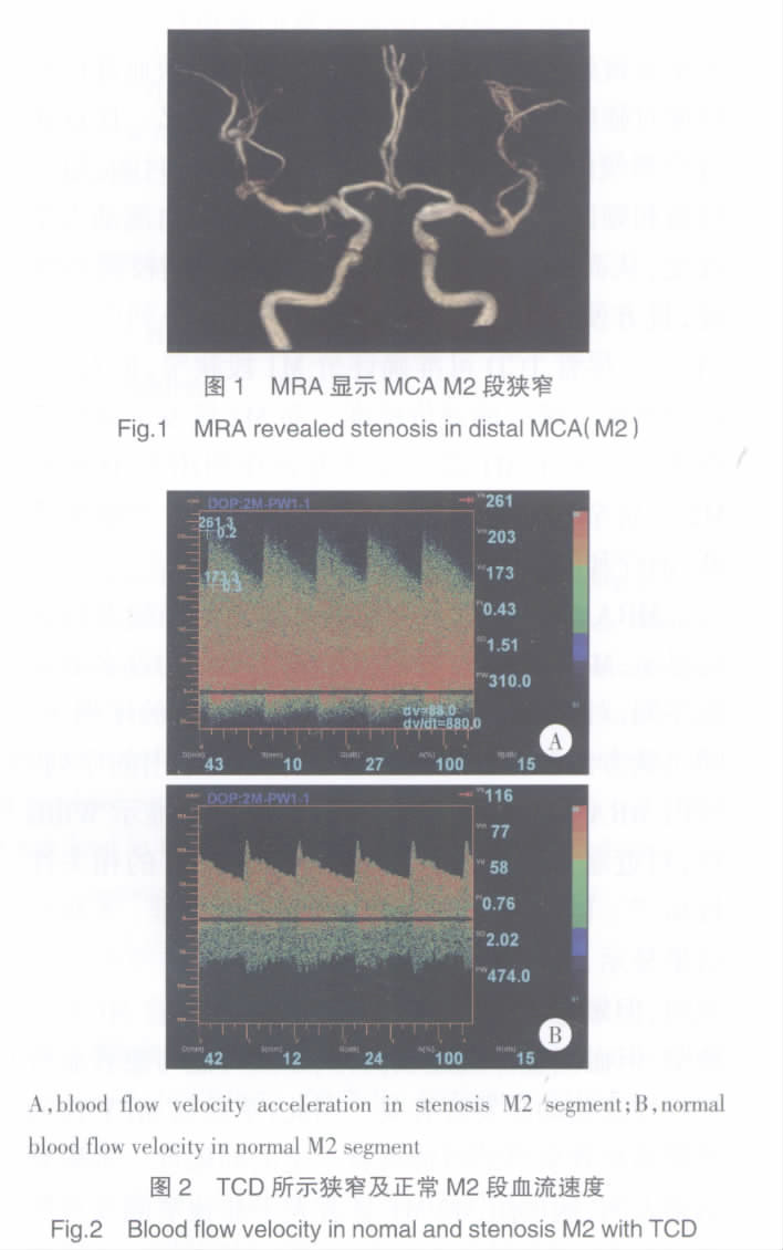 結(jié)論:TCD可以實時、動態(tài)的觀察CCF患者顱內(nèi)、外血管的血流及頻譜改變,為臨床提供可靠的血液動力學(xué)信息。《經(jīng)顱多普勒超聲評價大腦中動脈遠端狹窄的方法及準確性分析》(中國醫(yī)科大學(xué)學(xué)報第41 卷第3 期2012 年3 月)目的:探討經(jīng)顱多普勒超聲(TCD)評價大腦中動脈遠段(M2 段)狹窄的方法及可行性,為臨床評價M2 段狹窄提供重要的評價指標(biāo)。方法:選擇磁共振血管成像(MRA)證實單側(cè)M2 段狹窄>50%的患者159 例(病例組),TCD 檢測大腦中動脈近段(M1 段)及M2 段平均血流速度(MFV),計算M2 段與M1 段的MFV 比率(M2/M1)及M2 的非對稱指數(shù)(AI),并與162 例無腦動脈畸形及狹窄者(對照組)進行比較。同時計算各指標(biāo)評價M2 狹窄的準確性。結(jié)果:病例組M2/M1 顯著大于對照組。ROC 曲線顯示M2/M1 曲線下面積(0.957)最大,以0.97 為截點值診斷M2 段狹窄的敏感性和特異性分別為84.35%和86.22%,陽性預(yù)測值和陰性預(yù)測值分別為74.65%和91.24%。