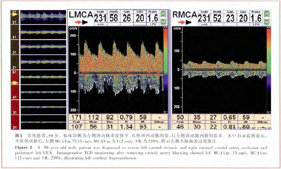 結(jié)論:頸動脈內(nèi)膜切除術(shù)圍手術(shù)期TCD 監(jiān)測可以早期發(fā)現(xiàn)術(shù)中和術(shù)后腦血流過度灌注,及時根據(jù)TCD監(jiān)測結(jié)果控制血壓異常變化,是減少術(shù)后腦出血并發(fā)癥之關(guān)鍵。《頸動脈內(nèi)膜切除術(shù)中監(jiān)測指標(biāo)間的相關(guān)性研究》(中國微侵襲神經(jīng)外科雜志2016 年05 月20 日第21 卷第5 期)目的:探討頸動脈內(nèi)膜切除術(shù)(CEA) 中,經(jīng)顱多普勒超聲(TCD) 和殘端壓監(jiān)測,能否等效判斷是否需要使用轉(zhuǎn)流。方法:回顧性分析63 例全身麻醉下行CEA 的病例資料,術(shù)中根據(jù)TCD(德力凱EMS-9A型號) 監(jiān)測指標(biāo)決定是否使用轉(zhuǎn)流,同時監(jiān)測殘端壓。結(jié)果:術(shù)中臨時阻斷頸動脈后,14 例(22.2%) 病人大腦中動脈平均血流速度(MCAVm) 下降幅度>50%,需使用轉(zhuǎn)流;35 例(55.6%)病人殘端壓<40 mmHg。在使用轉(zhuǎn)流的病例中,阻斷頸動脈后MCAVm 和基礎(chǔ)值的比例,與殘端壓之間存在線性關(guān)系(r2 = 0.41, F = 0.014,P = 0.014)。