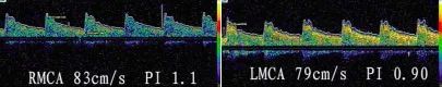 TCD檢測(cè):雙側(cè)MCA頻譜所示,雙側(cè)血流速度、頻譜形態(tài)均正常,而且雙側(cè)同名血管頻譜對(duì)稱,如下圖所示。