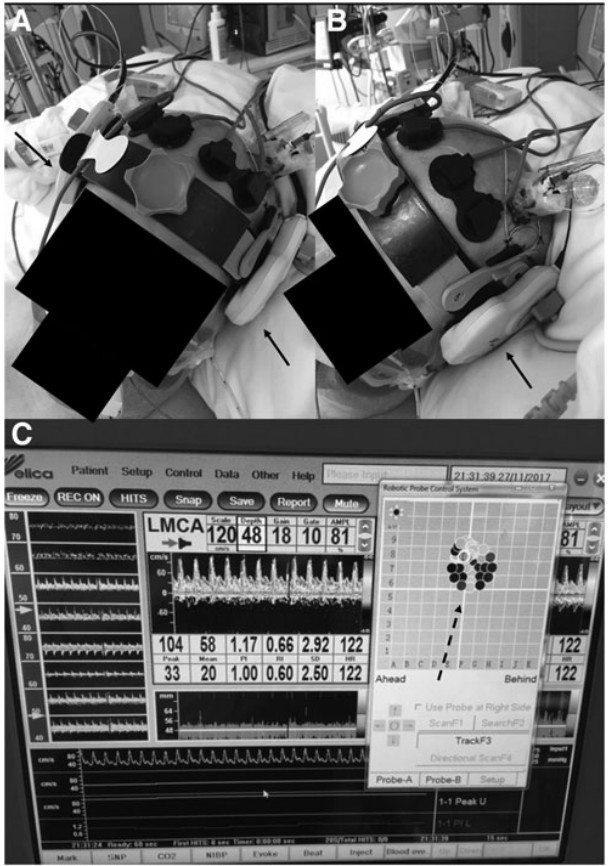 通過侵入性和非侵入性方法的監(jiān)測(cè)患者各種信號(hào)。通過德力凱EMS-9D配備的TCD全自動(dòng)探頭監(jiān)護(hù)系統(tǒng)(Delica,Shenzhen,China,goldeneaglemovingca.com)進(jìn)行大腦中動(dòng)脈腦血流速度(MCA CBFV)評(píng)估。該設(shè)備可利用TCD全自動(dòng)探頭監(jiān)護(hù)系統(tǒng)對(duì)大腦中動(dòng)脈腦血流速度進(jìn)行連續(xù)不間斷監(jiān)測(cè),因?yàn)樵揟CD全自動(dòng)探頭監(jiān)護(hù)系統(tǒng)具有自動(dòng)調(diào)整探頭方向搜尋血流的算法。據(jù)我們所知,這是首次通過TCD全自動(dòng)探頭監(jiān)護(hù)系統(tǒng)在重癥TBI患者中應(yīng)用延長持續(xù)時(shí)間TCD的研究。