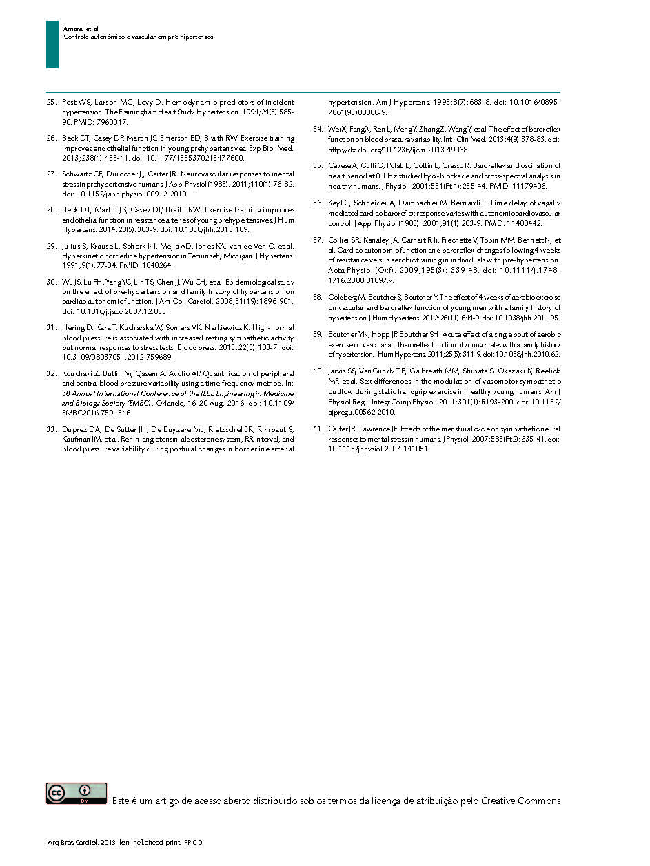 結(jié)果:與正常血壓個體相比的高血壓前期個體靜息時VC較高(3.48±1.26 Vs2.67±0.72單位,p = 0.05)和峰值反應(yīng)性充血更高(25,02±8.18 Vs18.66±6.07單位,p = 0.04)。各組心臟自主神經(jīng)調(diào)節(jié)指數(shù)相似。然而,在外周自主神經(jīng)調(diào)節(jié)中,與正常血壓個體相比,高血壓前患者的變異性更大(9.4 [4.9-12.7] vs 18.3 [14.8-26.7]mmHg2; p <0.01) 在SBP的超低頻 (6.9 [2.0-11.1] vs. 13.5 [10.7-22.4] mmHg2, p = 0.01)和低頻 (1.7 [1.0-3.0] vs. 3.0 [2.0-4.0] mmHg2, p = 0.04)有更高的頻譜分量。 此外,我們觀察到高血壓前患者壓力反射控制的增益低于正常血壓患者(12.16±4.18 vs.18.23±7.11ms / mmHg,p = 0.03),但相似的延遲時間(-1.55±0.66比-1.58±0.72s,p = 0.90)。
