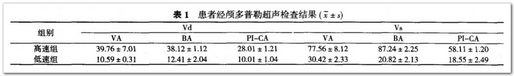 2.1 患者彩色多普勒頸部超聲及經(jīng)顱多普勒超聲檢查結(jié)果患者經(jīng)彩色多普勒超聲檢查 , 椎動(dòng)脈內(nèi)徑為 f0.4 1 ±0.22)cm ,PI值為(1.02 ±0.24)cm,R I值為 (0.65 ±0.11)cm ,V FO 值為 (102.08 ±30.22)cm ,V m 為 (25.44 ±3.43)cm 。 患者經(jīng)顱多普勒超聲檢查 ,分 為低 速組 和高速組 。 見表 1。