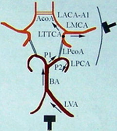 確認(rèn)試驗:因為TICA 在AcoA 之前,通常也在PcoA 之前,無側(cè)支供血,因此,壓迫同側(cè)CCA 后其血流速度完全消失或出現(xiàn)反向小尖波(血流倒灌)。這也是鑒別MCA 起始段與TICA 最好的方法。