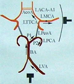 確認(rèn)試驗:壓迫同側(cè)CCA時MCA血流速度下降。當(dāng)PCA起源于同側(cè)ICA 時,壓同側(cè)CCA時PCA 血流速度亦下降。此時鑒別兩血管的主要依據(jù)為檢測的角度,檢測PCA 時探頭角度明顯朝向后枕部。如果該PCA 由ICA 供血,則睜閉眼試驗有助識別。