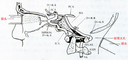經(jīng)枕骨下枕骨大孔的途徑使超聲束達到基底動脈及錐動脈顱內(nèi)段。