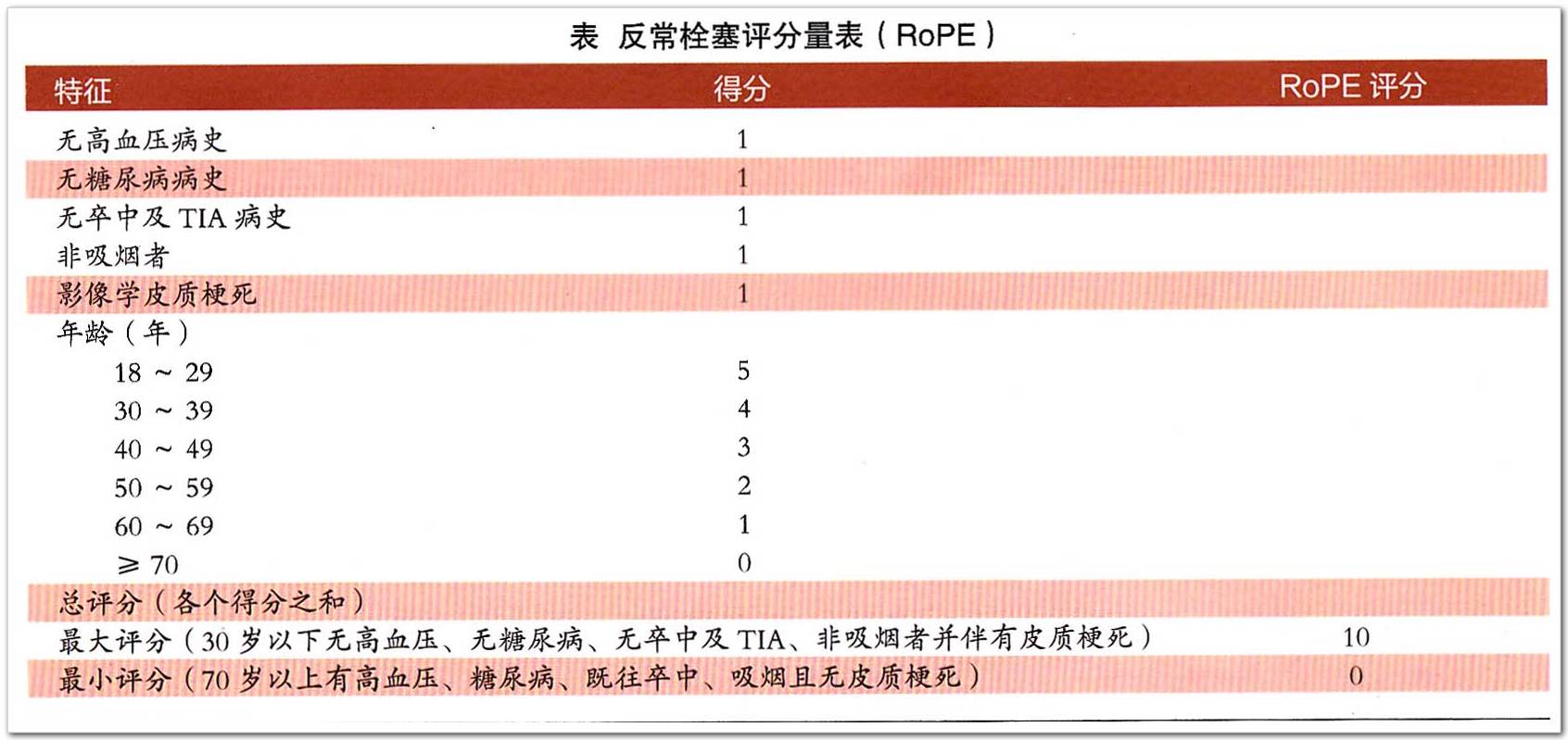 反常栓塞(RoPE)評分可以用來評估CS患者發(fā)現(xiàn)的PFO是偶發(fā)還是致病的。RoPE評分高(更為年輕,無血管性危險因素并存在表淺梗死)的患者更可能存在致病性的PFO,而RoPE評分低(伴有血管性危險因素并高齡)的患者其PFO可能是偶發(fā)的。