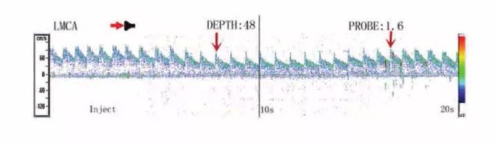 培訓(xùn)并熟練操作的護(hù)士組成。操作流程:①監(jiān)測左側(cè)大腦中動脈(LMCA),設(shè)置為雙深度模式(取樣容積10,深度差12),選取深度在48~52/60~64mm;②顯示血流監(jiān)護(hù)曲線,幫助判斷Valsalva動作的完成效力,有效的Valsalva動作的血流曲線表現(xiàn)為先下降再升高(見圖1);③患者取仰臥位,肘靜脈留置通路,接三通開關(guān),三通開關(guān)分別接兩支10ml注射器,其中一支裝有9ml生理鹽水+1ml清潔空氣并回抽一滴患者的血液[3],然后兩個注射器來回推注20次,制作成混血激活生理鹽水;④單通道監(jiān)測模式進(jìn)行記錄,按下秒表,將混血激活生理鹽水“彈丸”式全部注射,記錄推注后20s內(nèi)的血流及栓子信號情況;⑤間隔2分鐘;⑥再次進(jìn)入監(jiān)測記錄模式,再次推注混血激活鹽水,囑患者在推注后5秒做Valsalva動作,即深吸氣后屏氣10s,再呼氣,觀察TCD屏幕20s內(nèi)的血流及栓子信號情況;⑦間隔2分鐘,重復(fù)步驟⑥一次。