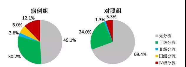 2.1 病例組和對照組的RLS陽性率及分流量如下。在病例組中,RLS的陽性率為50.9%(59/116),其中,Ⅰ級分流35例(30.2%),Ⅱ級分流3例(2.6%),Ⅲ級分流7例(6.0%),Ⅳ級分流14例(12.1%)。對照組中,RLS的陽性率為30.6%(23/75),其中,Ⅰ級分流18例(24.0%),Ⅱ級分流1例(1.3%),Ⅲ級分流0例(0%),Ⅳ級分流4例(5.3%)。以上率的分布見圖3。