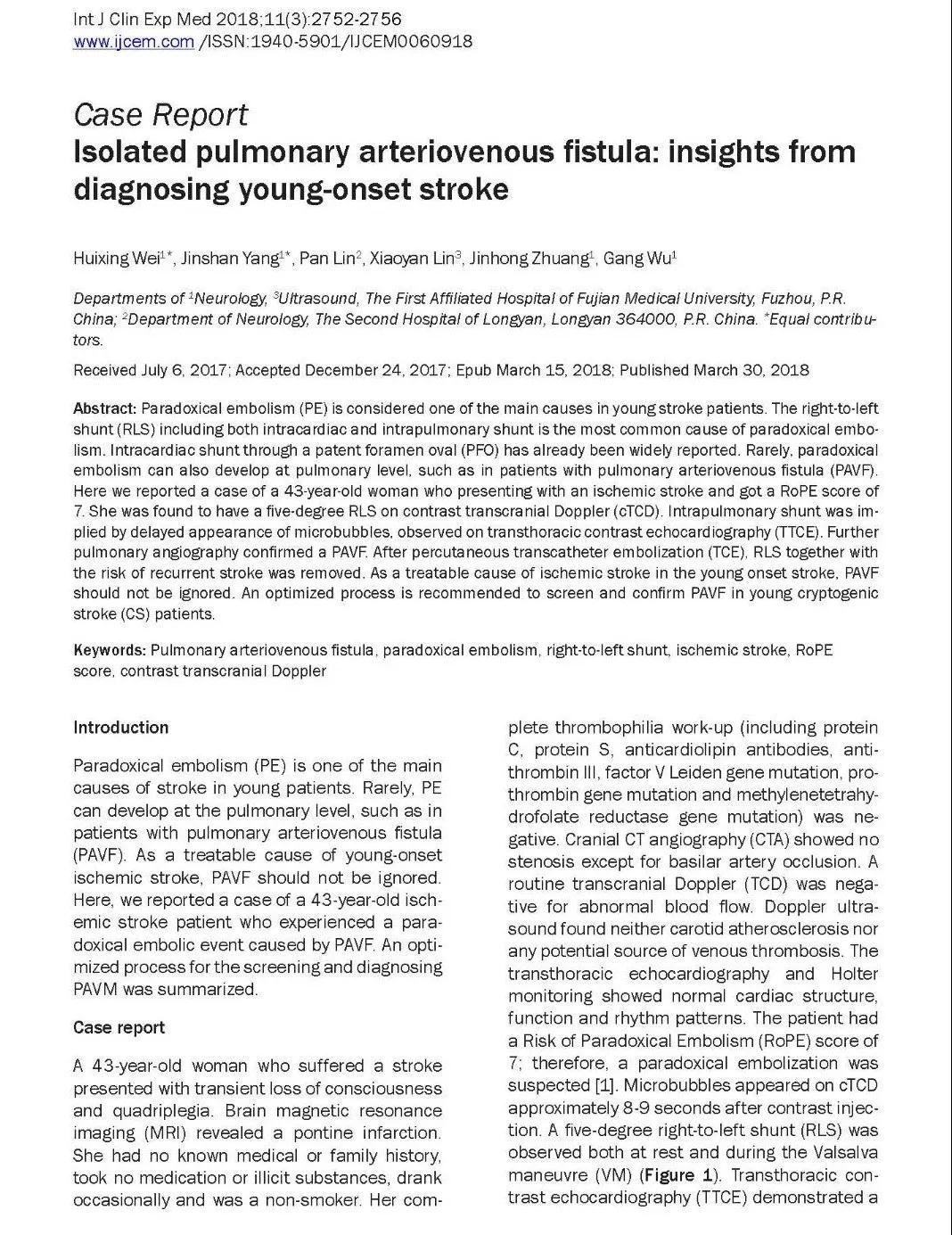 反常栓塞(Paradoxical embolism,PE)被認為是誘發(fā)青年卒中的主要因素之一。心臟和肺內(nèi)的血液右向左分流(right-to-left shunt,RLS)則是導(dǎo)致反常栓塞的最常見原因。心腔內(nèi)通過卵圓孔(patent foramen oval,PFO)的RLS已經(jīng)被大量文獻報道。雖然肺內(nèi)的RLS也會引發(fā)反常栓塞,例如肺動靜脈瘺(pulmonary arteriovenous fistula,PAVF)的患者,但是卻鮮見報道。