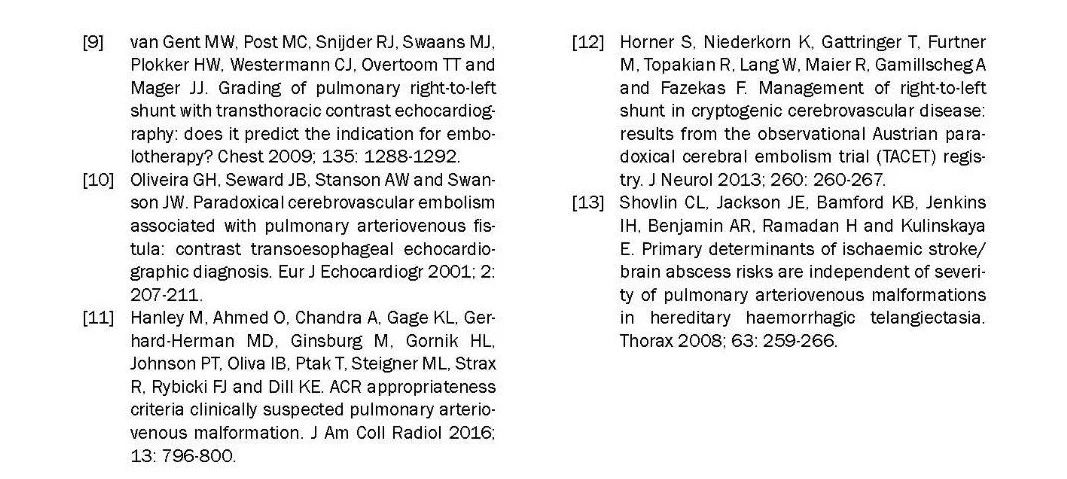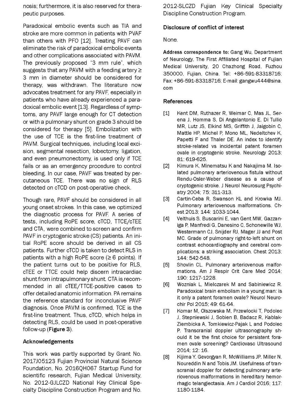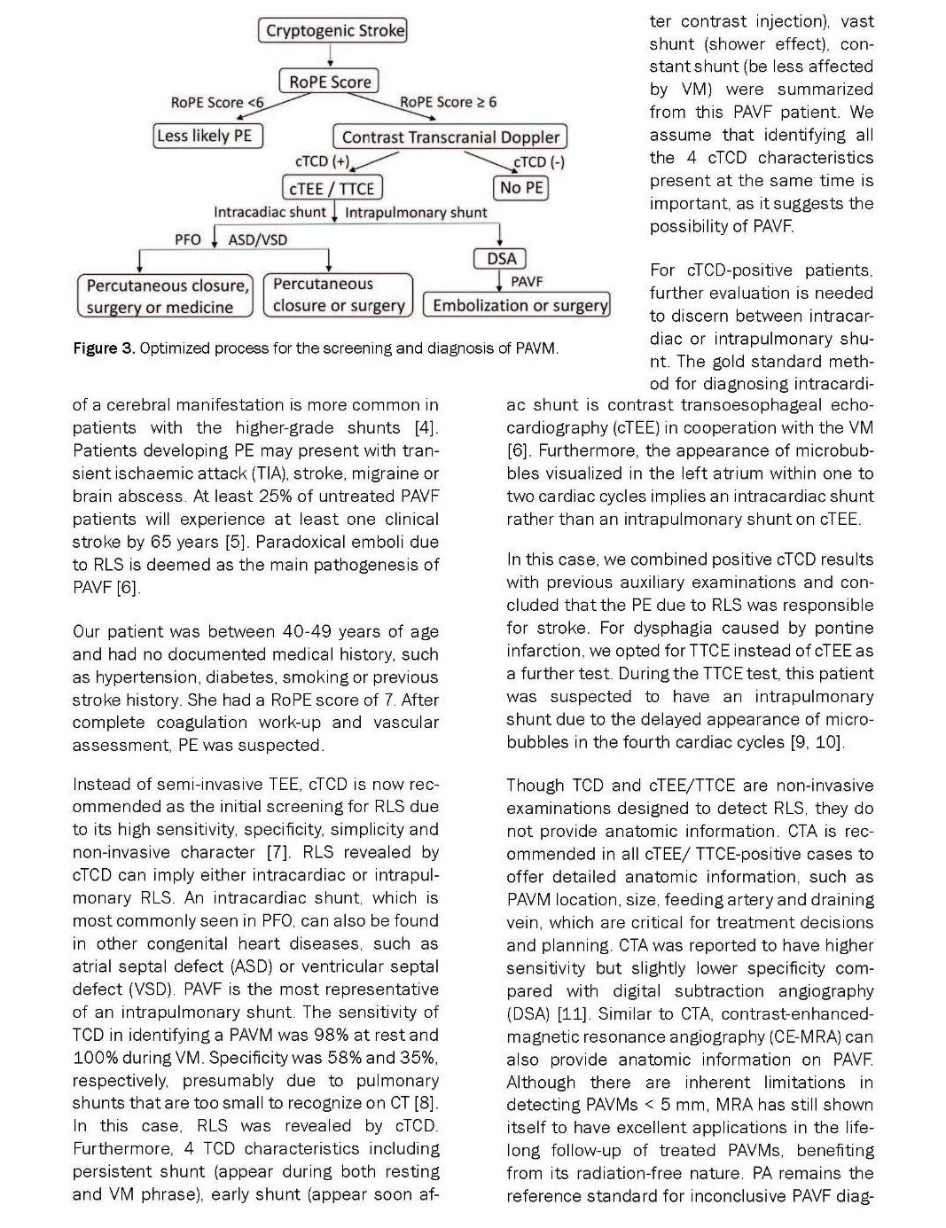 本文中我們報道了一例43歲缺血性中風(fēng)患者,她的RoPE評分為7分。通過對比增強經(jīng)顱多普勒成像(contrast transcranial Doppler,cTCD),診斷其為5度RLS。通過對比增強經(jīng)胸超聲心動圖(transthoracic contrast echocardiography,TTCE)觀察到氣泡的延遲出現(xiàn),證實了肺內(nèi)分流的存在。進一步的肺內(nèi)血管造影證實了PVAF。經(jīng)皮導(dǎo)管栓塞術(shù)(percutaneous transcatheter embolization,TCE)后,RLS與繼發(fā)卒中的風(fēng)險被一并消除。